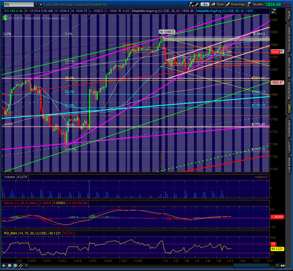 Minis 4hr - Your first sign a big change may be happening is the breakdown of pink rising wedge support. This could be the final reset of the lower support diagonal before one last push up, but given all the factors above it could also be the beginning of some sort of meaningful correction. Key support goes red 1824, green and blue near 1800, pink at 1775 and the red line of death at 1750.