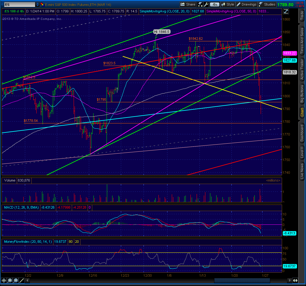 Minis 4hr - OK, brand spanking new minis chart built just in time apparently. This really looks bad, as it should coming off the horrific technical top I've been showing (and even shorted) for a few weeks now. The lowest red diagonal (1760ish) is CRITICAL. That is my red line of death.