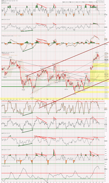 SPX 30m - Bout the only thing that I can come up with other than massive consolidation under key round numbers and the ATH carrot is this possible channel. Other than that no real larger patterns to speak of. Some neg divs working in but nothing is screaming at me right now other than 40 points of open gaps below leaving a support less void should this thing turn.