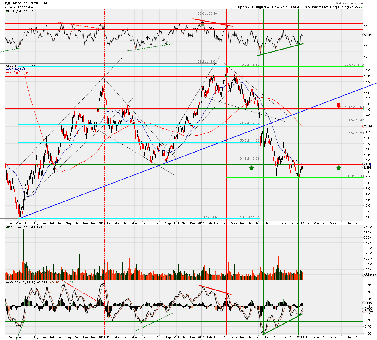Daily AA - Quite the double bottom with strong buy divergences. No real patterns exist here. Price just simply violently fell into support near 9.60. The range (9-17) since the '08 fall and recovery is clear to see.